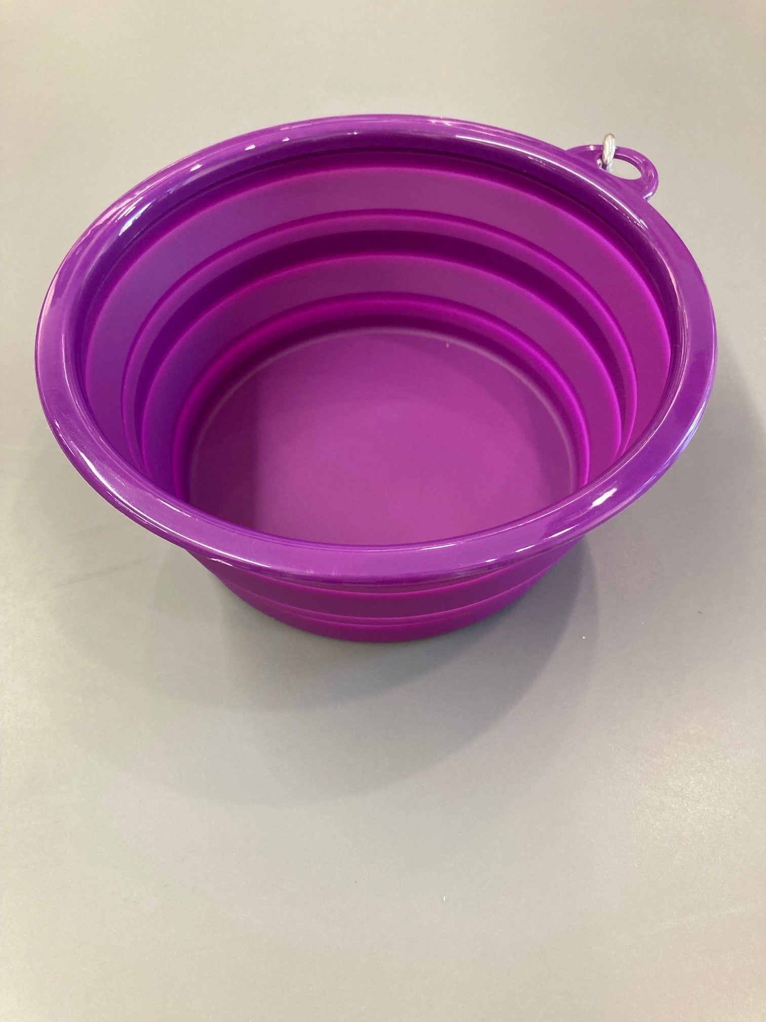 Make sure your pets have easy access to food and water while they're traveling with you. This customized collapsible silicone bowl has an 32 ounce capacity and works well for holding food or water. Includes a clip for attaching to a leash, backpack, or belt buckle for hands-free transport.