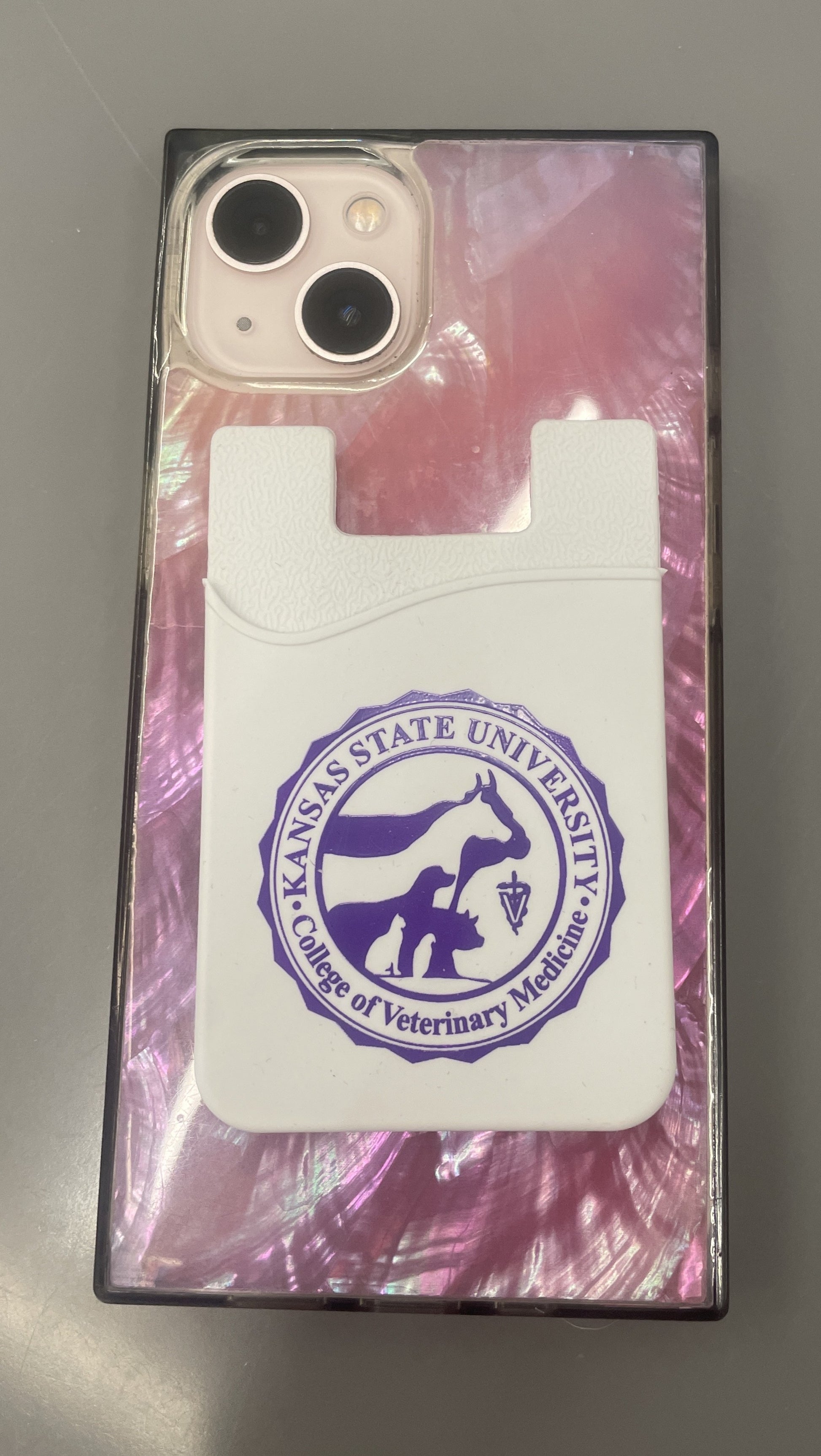 White - Adhesive Cell Phone Wallet with CVM Seal logo in purple.