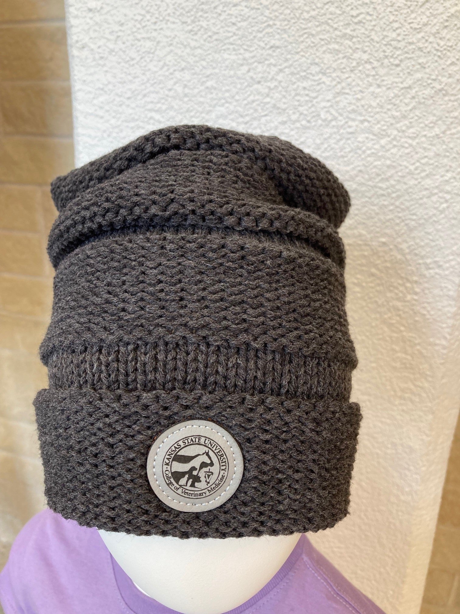 Customized Scrunch Knit Beanie with patch in Heathered Charcoal.