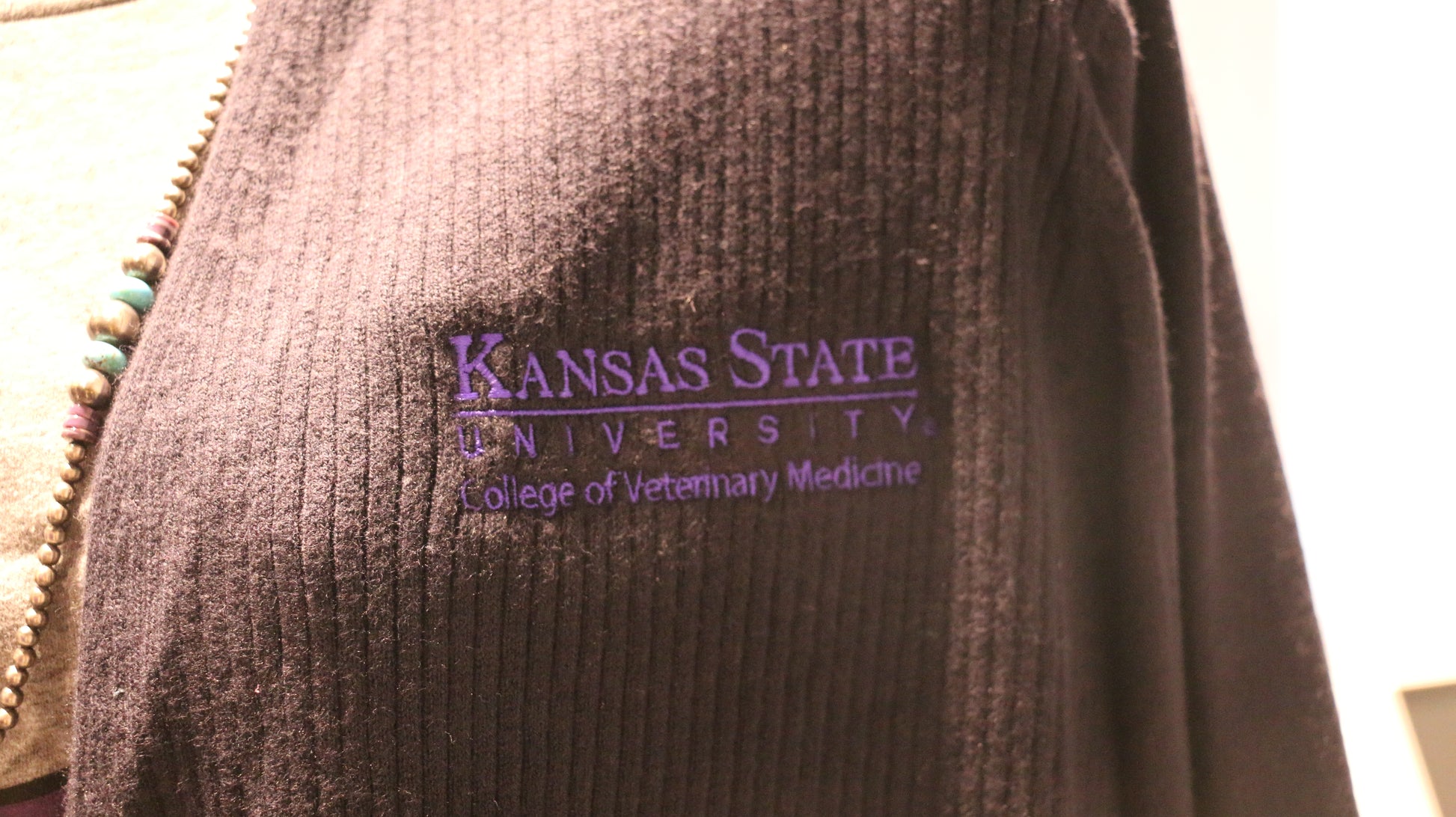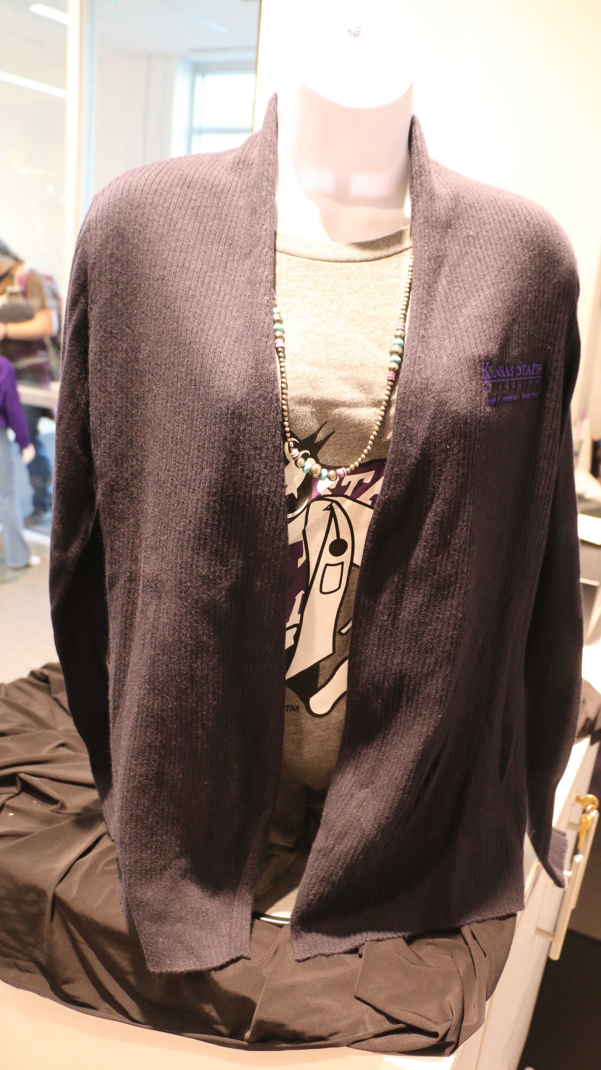 Customized Ladies Port Authority Ribbed Knit open front cardigan in black with purple lettering.